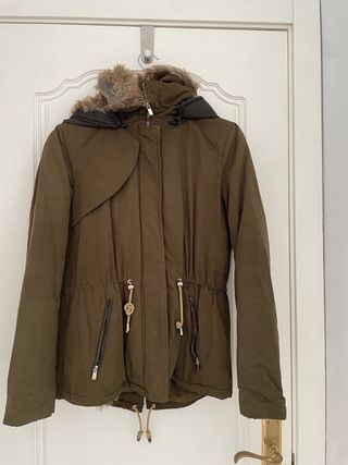 Abrigo de Bershka con capucha y detalles de pelo. - Color verde militar. - Cierre con cremallera y botones. - Cintura ajustable con cordón. - Bolsillos delanteros con cremallera. -Tiene por dentro un forro que se puede quitar con los botones . -Talla XS . -Nuevo , sin usar . -Cualquier cosa no dude en consultar.