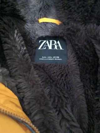 Anorak de la marca Zara en color mostaza. Cuenta con capucha y detalles de pelo. - Cierre de cremallera frontal. - Bolsillos laterales con cremallera. - Puños ajustados. - Capucha desmontable con cremallera