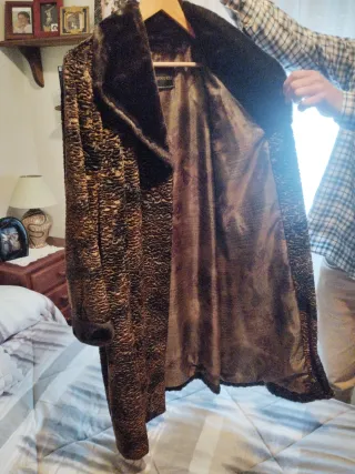 Elegante abrigo de pelo natural, perfecto para añadir un toque sofisticado a tu vestuario. - Material: Pelo natural - Color: Tonos beige y marrón Abrigo largo de pelo suave y muy calentito, ideal para invierno y días de frío intenso. Diseño elegante y atemporal, con cuello amplio tipo solapa que queda precioso puesto. Color camel/beige muy combinable, perfecto tanto para looks casuales como más arreglados. ✨ Detalles: • Abrigo de pelo sintético (tacto muy suave) • Largo por debajo de la cadera • • Forro interior completo • Corte recto, favorecedor ⚠️ Importante: el forro interior tiene un pequeño descosido (ver fotos)