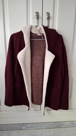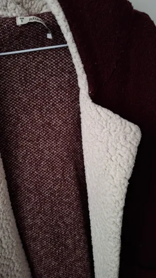 Chaqueta-abrigo de lana en color burdeos y pelo de borreguito en color crema. De mujer, de Pull&Bear, talla S. Dos bolsillos delanteros, capucha. Está muy usada, aunque bien conservada.