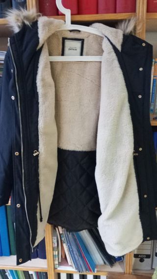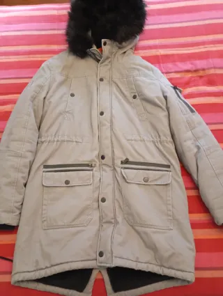 Abrigo de invierno con un diseño moderno y cálido. - Capucha con detalle de pelo sintético. - Cierre frontal con cremallera y botones. - Bolsillos frontales con solapa y cremallera lateral. - Puños y cintura elásticos. ( LE FALTA LA CREMALLERA CENTAL, ALGUN BOTÓN,Y EL BOLSILLO EXTERIOR, QUE TIENE A LA ALTURA DEL PECHO,ESTA DESCOSIDO EN UN LATERAL)
