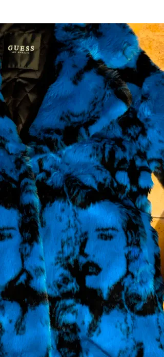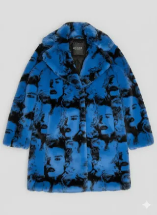 Abrigo de pelo sintético con un llamativo estampado de caras en azul y negro. Un diseño único para destacar. - Tacto suave y cálido. - Cuello solapa clásico. - Cierre frontal.