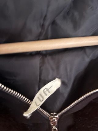 Abrigo negro de plumas con cinturón.Altura caderas - Capucha con pelo no desmontable - Cinturón con hebilla plateada. -2 bolsillos a los lados del cuerpo,otro en la manga izquierda y uno el interior. Todos con cierre de cremallera. -Abriga mucho(50% pluma y 50% plumón de pato) Es una talla 40 pero no es tan grande. Yo tengo una 36-38 y me queda bien con un jersey