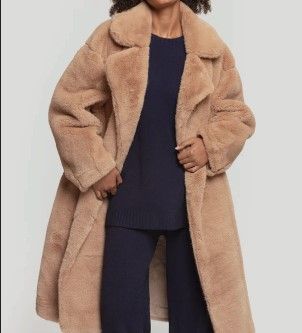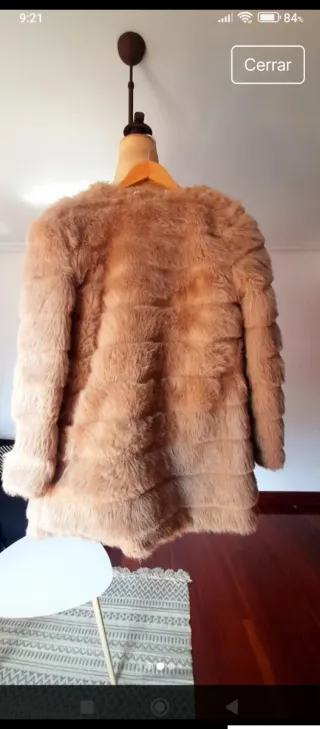 Abrigo de pelo sintético en color beige. Es una prenda suave y cálida, con un diseño moderno. Se cierra con corchetes. Tiene un.pequeña tara.Tiene 1 cuello más alto que otro Solucionable - Tacto muy agradable. - Corte holgado.