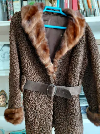 Abrigo de pelo muy cálido, perfecto para el frío. Vintage,reformado.Cuello,puños y el forro totslmente cambiado. Moderno,entallado y con cinturón( este si se ha usado) - Diseño de dos tejidos. - Detalle de cinturón con hebilla.