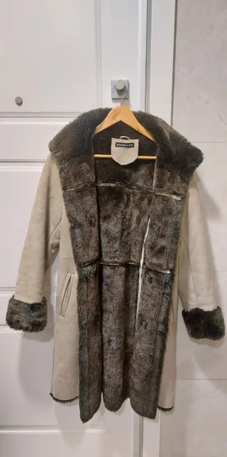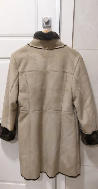 - Acabado exterior en ante sintético tipo serraje. Color beige con interior de pelo marrón. - Detalle fijo de pelo en cuello y puños. Capucha desmontable, talla M tirando a S. Cerrado con las 3 trabillas. En buen estado. No hago envios.