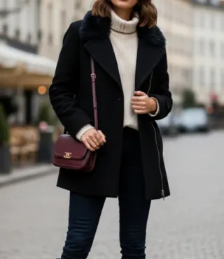 Elegante abrigo de paño de Zara con un bonito cuello de pelo sintético. - Diseño con botones. - Mangas acampanadas. - Bolsillos laterales.