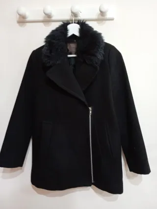 Elegante abrigo negro con detalles de pelo en el cuello. Talla S de Cortefiel