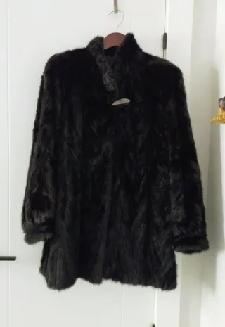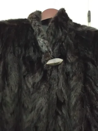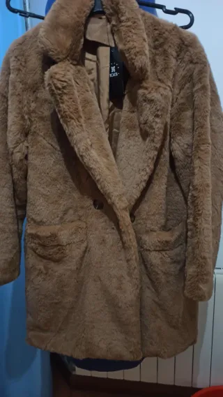 Abrigo de pelo sintético en color marrón. Tiene un diseño elegante con solapas y cierre de botones. - Material: Pelo sintético. - Cierre: Botones. - Bolsillos: Dos frontales. El color es más como la primera foto, con la otra luz se ve más raro, pero es para ver los detalles.