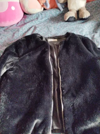 Abrigo cazadora de niña de la talla 9-10 años con un diseño moderno y cálido. - Cuello con pelo sintético. - Tejido texturizado en tonos grises y negros. el pelo del cuello se puede poner o quitar mediante botones se entrega limpio