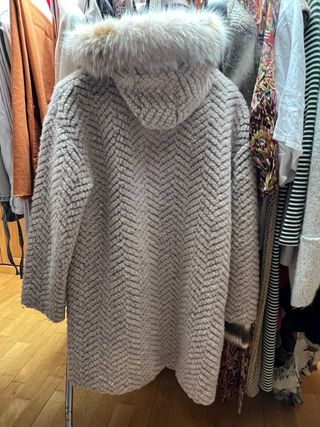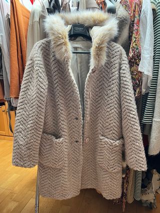 Vendo precioso y elegante abrigo italiano de mujer, color beige rosáceo con cuello de pelo, talla L pequeña, perfecto para añadir un toque sofisticado a tu armario. - Diseño con textura chevron. - Detalle de pelo en la capucha. - Dos bolsillos frontales. - Composición 70% lana Gran ocasión!