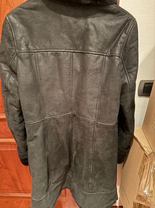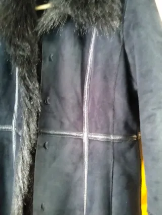 Elegante chaquetón negro de ante con interior de pelo. - Diseño largo. - Cierre frontal. - Costuras decorativas. - Detalles en cuero negro.