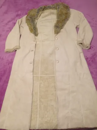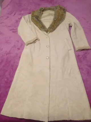 Elegante abrigo largo con detalles de pelo. - Color beige y marrón. - Cuello y puños con pelo sintético. - Cierre de botones. - Bolsillos laterales. - Talla 46, aunque parece 44. - Puesto solo una vez sobre un vestido de novia.