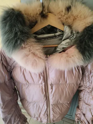 Chamarra acolchada con un diseño moderno y elegante. Cuenta con un gorro adornado con pelo natural . Chaqueta dos carras .Rosa polvo /Gris metalizadas las dos - Cierre frontal con cremallera. - Mangas con detalle fruncido. - Cintura con cordón ajustable.