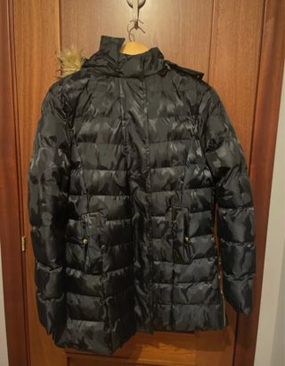 Abrigo largo de invierno con acabado brillante y diseño acolchado. - Capucha con pelo. - Bolsillos frontales con cremallera. - Cierre de cremallera frontal. -27€, Entrega en mano