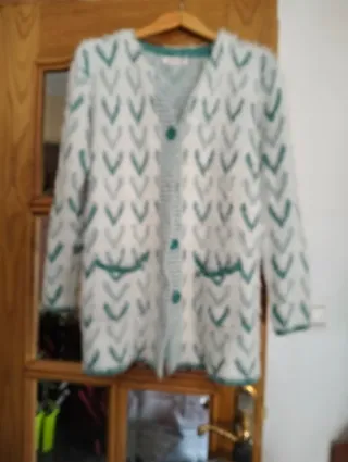Chaqueta de tacto suave con un bonito estampado. - Diseño de espigas en verde y blanco. - Abertura frontal con botones. - Bolsillos delanteros. - Acabado de pelo, largo 0,80 contorno manga 0,92, contorno pecho 112
