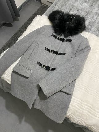 Abrigo de paño gris con detalles de hebillas y pelo. - Cuello con pelo sintético negro. - Cierre con hebillas y trabillas. - Bolsillos delanteros.