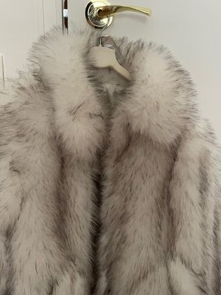 Elegante abrigo de pelo sintético en tono blanco. Su forro interior es de satén brillante. - Diseño con cuello. - Manga larga. - Pone que es una 42, pero talla mas pequeño diria que como una m (38-40)