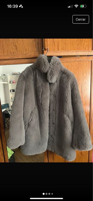 Abrigo de pelo sintético en color gris. Es una prenda suave y cálida, esta como nuevo. Cierre con botones.