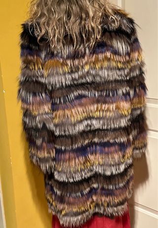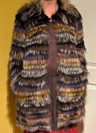 Abrigo de pelo sintético 3/4 con un diseño tricolor muy llamativo - Diseño de pelo largo y voluminoso. - Cierre frontal. - Largo hasta las rodillas.