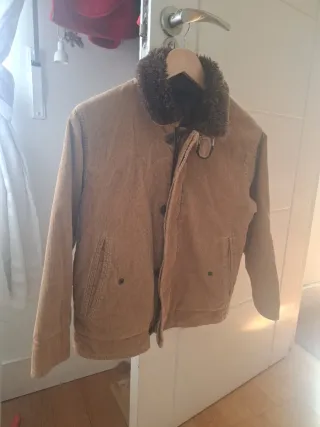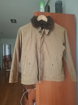 Abrigo de pana en color beige, perfecto para el frío. - Cuello con detalle de pelo sintético. - Cierre de botones y cremallera. - Dos bolsillos delanteros con botón.