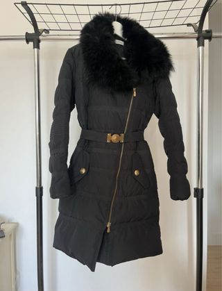Elegante abrigo largo de Versace para mujer. - Diseño acolchado. - Cuello con pelo sintético. - Cinturón con detalle dorado. - Cierre asimétrico con cremallera. 40 de Hombros y 95 de Largo Hago envíos o trato en mano en Madrid (Chamberí)