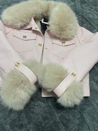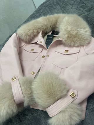 Chaqueta de suave material con detalles de pelo. - Acabado en tono rosa. - Adornos metálicos dorados.