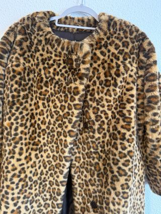 Abrigo de pelo sintético con estampado de leopardo en tonos marrones. - Material exterior: pelo sintético. - Forro interior de satén, con un roto (ver foto) - No pone talla pero es entre M-L.