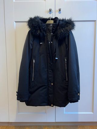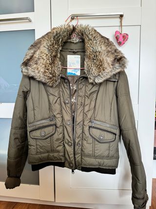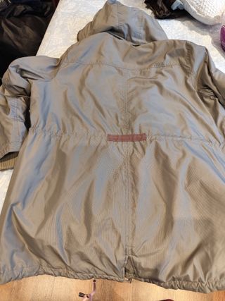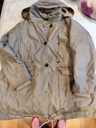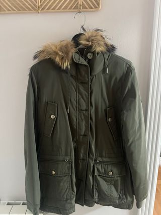 Parka de Lefties en color beige oscuro. Comprada nueva hace unos días y usada muy poco. La vendo porque no me combina bien con lo que tengo. Tiene capucha y forro interior de pelo en toda la zona del tronco y forro normal sin pelo en los brazos con lo cual es ideal para entretiempo pues abriga sin dar demasiado calor. Talla S. Corte holgado y amplio. Ligera. Cierre de cremallera y botones y dos bolsillos frontales de muy buen tamaño.