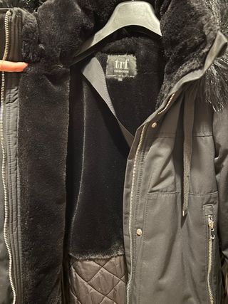 Abrigo negro de Zara con capucha. - Capucha con detalle de pelo. Pelo desmontable con cremallera - Cierre de cremallera y botones. - Bolsillos frontales con cremallera.