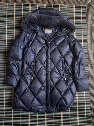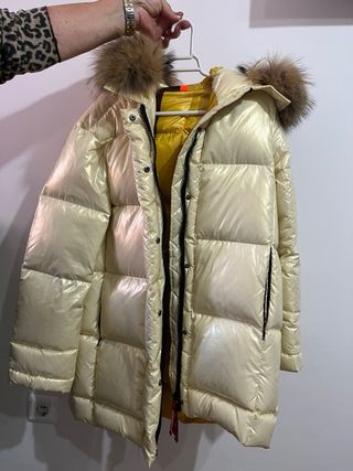 Gabardina elegante de El Corte Inglés. - Color blanco roto. - Diseño acolchado. - Cuello con pelo sintético. - Cierre de cremallera. - Muy pocas puestas porque me queda pequeña, es una talla M bastante justita.