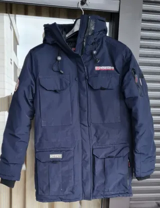 Abrigo de invierno de la marca Geographical Norway en color azul. Cuenta con varios bolsillos frontales y un diseño funcional. - Cuatro bolsillos frontales con solapa. - Bolsillo adicional en la manga. - Cierre de cremallera y botones. - Capucha ajustable. El pelo de la capucha es desmontable. Medidas 73 x 50. Mangas 62 ver imágenes.