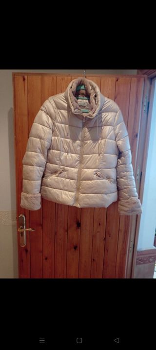 Abrigo color beige con brillo, con pelo sintético en la zona del cuello interior y los puños. Un poco entallado. Como nuevo por error de talla.