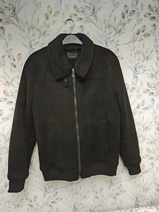 Chaqueta de ante sintético de Bershka en color negro, con forro interior de borreguito muy suave y cálido, ideal para otoño e invierno. Cuenta con cuello de borreguito a juego, cremallera metálica frontal, dos bolsillos laterales y acabados de puño y bajo elásticos para un mejor ajuste. Sin uso, lista para estreno - Cuello de pelo sintético. - Cierre de cremallera. - Bolsillos laterales.