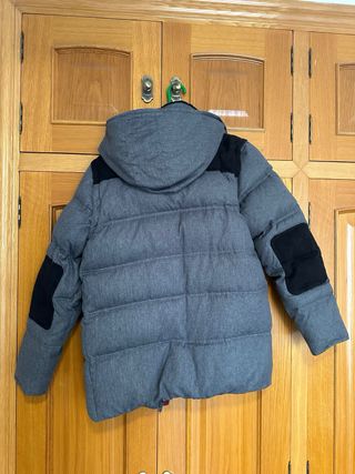 Chaqueta de invierno juvenil con capucha y detalles en azul. - Capucha con pelo sintético. - Cierre de cremallera y botones. - Múltiples bolsillos frontales. - Parche decorativo en la manga. - Parche con diseño de montaña en el pecho. Relleno acolchado muy calentito. Usada pocas veces. El tejido exterior repele el agua. Perfecta para la nieve.