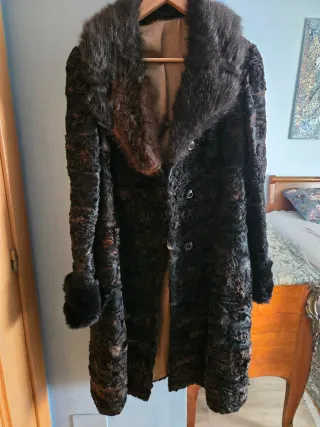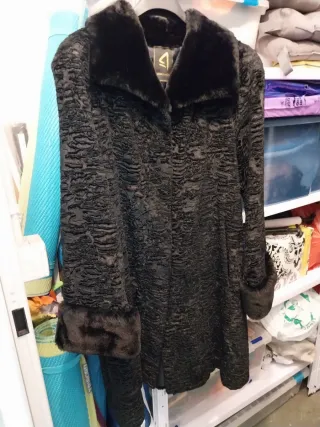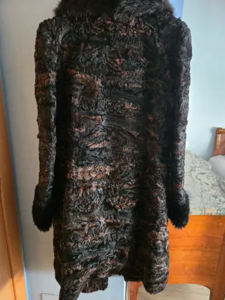 Abrigo entallado de astracán forrado en raso nuevo en modista . Cuellos y puños de pelo ( no sé si natural o no). Diseño actual, nada retro, no desfasado. Queda genial con ropa actual, vaqueros y ropa informal. Es una 40 entallada o 38 más holgada.