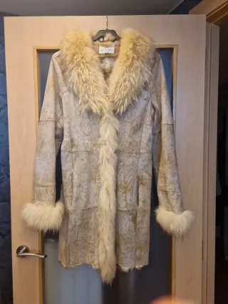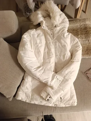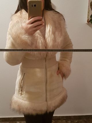 Prácticamente nuevo(muy poco uso). Talla M. Color marfil.Dos bolsillos laterales. Cuello y puños de pelo artificial
