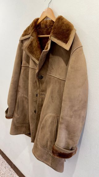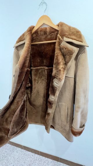 Abrigo de ante marrón con cuello de borrego.