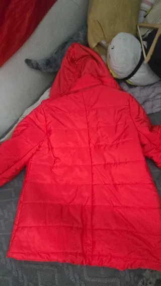Abrigo de invierno con un diseño llamativo y cálido. - Color exterior rojo vibrante. - Forro interior de pelo sintético en tono marrón oscuro. - Acolchado interior en color naranja. - Cierre de cremallera y botones. - Bolsillos frontales con cremallera.