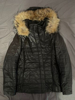 Chaqueta de cuero con forro interior de pelo, ideal para mantener el calor. - Cierre de cremallera frontal. - Bolsillos laterales con cremallera. - Cuello redondo y puños elásticos.