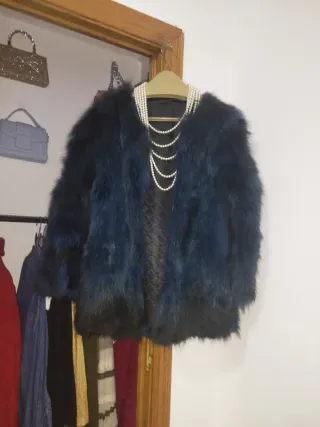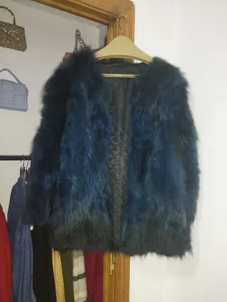 Abrigo con un tacto muy suave y un diseño llamativo, bien cuidado no bota pelo, bien confeccionado talla M - Estilo peludito. - Combinación de colores azul y negro.