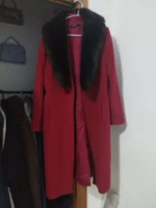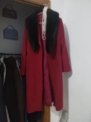 Abrigo de paño largo con un diseño elegante y un cuello de pelo sintético. Lo peludi se quita y se pone es talla 42 XL pero entalla como una talla M - Color: Rojo - Cuello: Pelo sintético - Largo: Hasta mas abajo de la rodilla elegante Sofisticado pero juvenil también se puede usar como quiera solo venta en persona mercado central