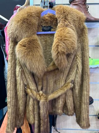 Elegante abrigo de visón sintético con un diseño moderno y sofisticado. La prenda cuenta con un cinturón para ajustar a la cintura y un cuello de pelo que le da un toque de lujo. - Material: Visón sintético. - Color: Beige y marrón. - Talla: M (38/10).