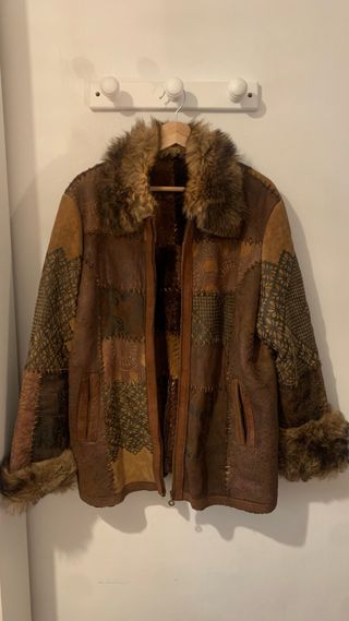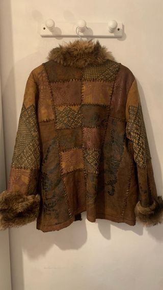 Abrigo de piel con un diseño patchwork único. Vintage. - Acabado en tonos marrones y multicolor. - Detalle de pelo en cuello y puños.
