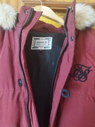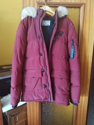 Abrigo acolchado con capucha de SikSilk en color rojo. - Capucha con pelo sintético. - Cierre de cremallera y botones. - Bolsillos frontales con solapa. - Detalle de bolsillo en manga con cremallera.