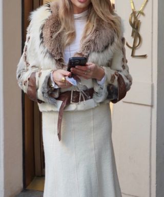 Elegante abrigo de piel con detalles en tonos beige y marrón. - Cuello y puños de pelo. - Forro interior con estampado de serpiente. - Diseño entallado. Old price 250e new price 195e