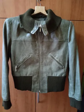 Chaqueta de estilo bomber con cuello y puños de canalé. - Material: Piel - Color: Verde - Diseño: Bomber - Cierre: Cremallera frontal - Bolsillos: Dos bolsillos frontales con cremallera