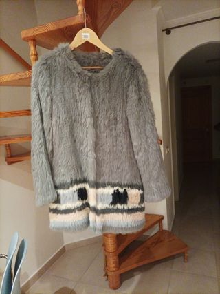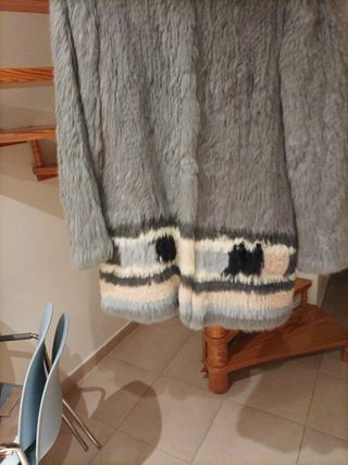 Abrigo piel de conejo color gris, con cenefa de colores en el bajo. Tiene bolsillos.