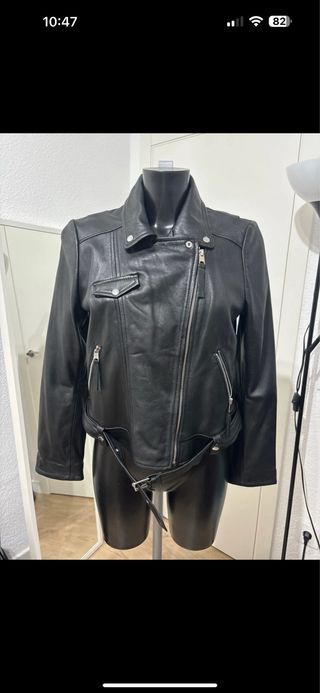 Cazadora de mujer estilo motero de zara, negra, un clásico atemporal para cualquier armario. En etiqueta es talla XL pequeña, estrecha. Diría que es una 38/M o L pequeña - Diseño con cremallera asimétrica. - Bolsillo con solapa en el pecho. - Cinturón con hebilla. - Puños con cremallera. - 100% piel ovina poliester. Importante⚠️👇🏼 *Leer y comparar todas las medidas de largo, sisa, manga y hombros puestas en las fotos. Esta prenda a sido cuidada con mucho mimo y está en muy buen estado. Segunda mano. zara