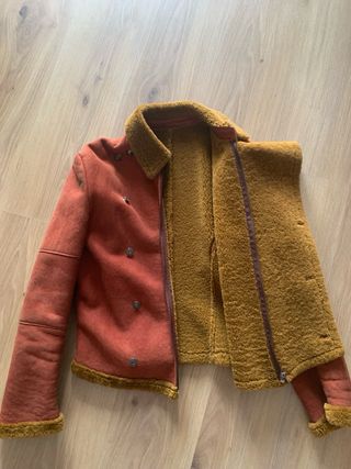 Cazadora de piel con un diseño moderno y cálido. Comorada en closed Leon hace años, no tiene etiqueta, asi que no tiene MARCA - interior de borreguito. - Cierre cruzado con botones, estilo casaca - Detalle de costuras.